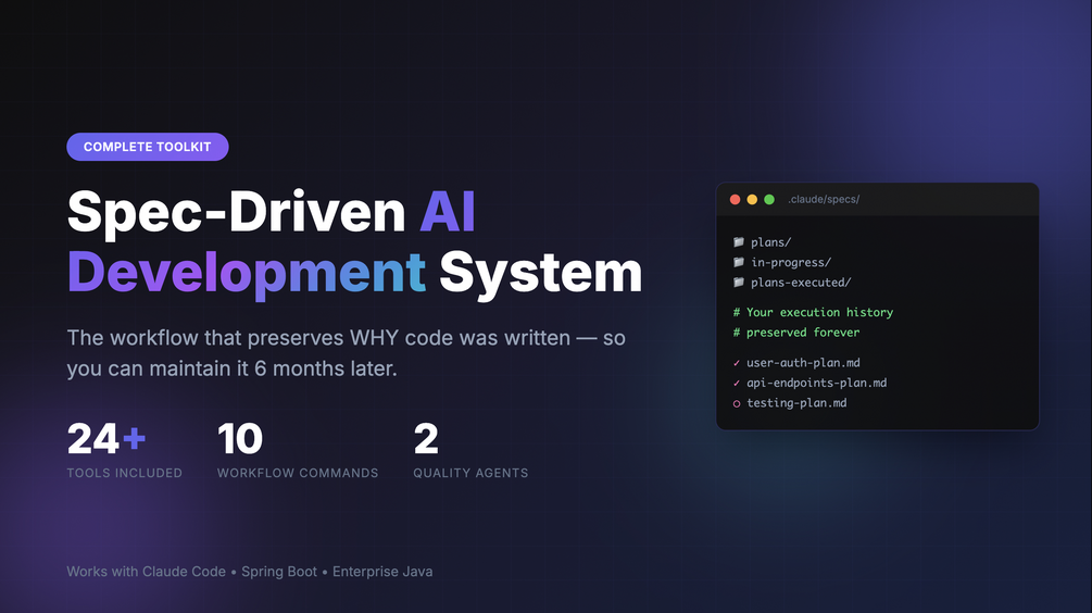 A complete workflow system for AI-assisted development that preserves WHY code was written — not just what. Includes 24+ production-tested tools: spec generators, session management, git workflows, Spring Boot test generation, and automated code review agents. Stop writing code you can't maintain 6 months later.